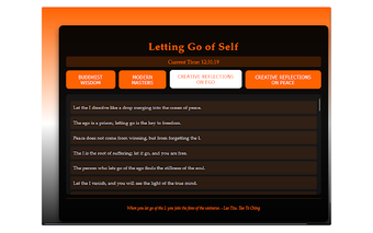การปล่อยวางตัวตนเป็นส่วนขยายของ Chrome ที่ออกแบบมาเพื่อส่งเสริมการมีสติและส่งเสริมความสงบภายในผ่านการรวบรวมคำคม 100 ข้อ คำคมเหล่านี้จัดเรียงเป็นสี่หมวดหมู่ที่แตกต่างกัน: ปัญญาพุทธ, อาจารย์สมัยใหม่, การสะท้อนความคิดสร้างสรรค์เกี่ยวกับอีโก้, และการสะท้อนความคิดสร้างสรรค์เกี่ยวกับสันติภาพ ส่วนติดต่อผู้ใช้เป็นมิตรกับผู้ใช้ มีปุ่มนำทางที่เรียบง่ายซึ่งช่วยให้ผู้ใช้เข้าถึงคำคมได้อย่างง่ายดาย ซึ่งจะแสดงในธีมสีส้ม-ดำ-ขาวที่สดใส นอกจากนี้ ส่วนขยายยังมีนาฬิกาแบบเรียลไทม์และคำคมที่โดดเด่นจากเหลาอู่จื้อ ซึ่งช่วยเพิ่มประสบการณ์โดยรวม